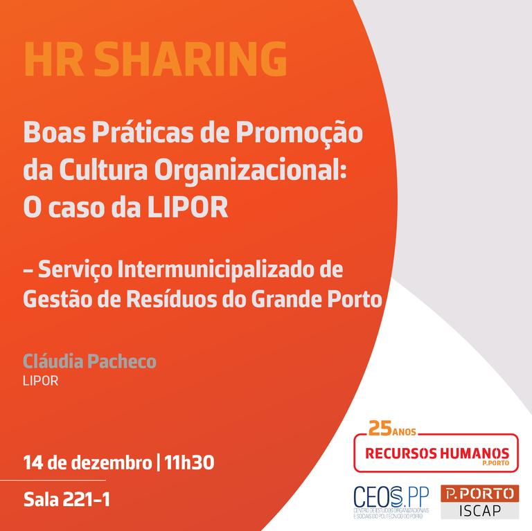 On December 14, it will be held at ISCAP, a seminar of the HR SHARING conference cycle promoted by the partnership of the Degree in Human Resources, Master in Management and Human Resources Development and Human Resources Group of CEOS.PP - Centro de Estudos Organizacionais e Sociais do Politécnico do Porto.
