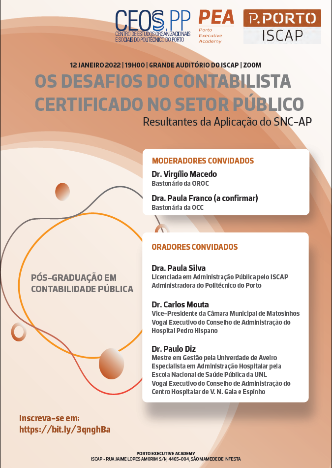 Dia 12 de janeiro de 2022, pelas 19h00, realizar-se-á a I Conferência em Contabilidade Pública subordinado ao tema: Os Desafios do Contabilista Certificado no Setor Público resultante do SNC-AP.